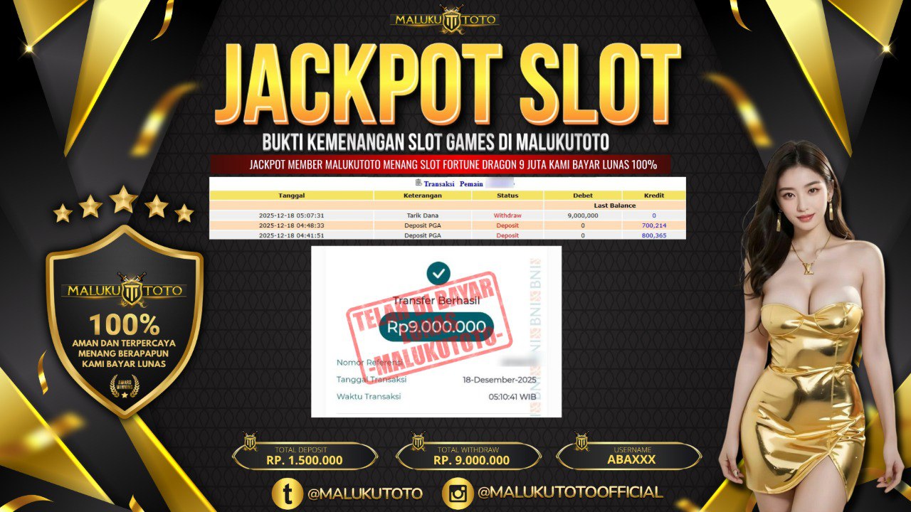 Selamat kepada User id : ABA** Telah berhasil mendapatkan kemenangan besar pada permainan SLOT FORTUNE DRAGON kemenangan Sebesar Rp. 9.000.000, Setelah mengisi formulir withdraw dengan kurung waktu hanya 3 – 5 menit pihak malukutoto sudah melakukan transfer kepada pemilik Userid dan dana sudah dapat di cairkan oleh pemenang. Bukti pembayaran yang kami berikan merupakan bukti pembayaran yang SAH / VALID yang langung di dapatkan melaui tanda transfer transaksi dari Bank yang di tuju.
