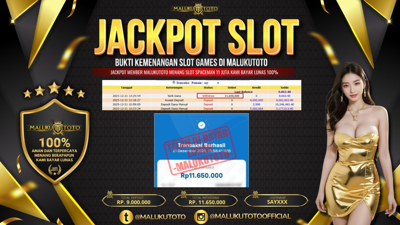 Selamat kepada User id : SAY** Telah berhasil mendapatkan kemenangan besar pada permainan SLOT SPACEMAN kemenangan Sebesar Rp. 11.650.000, Setelah mengisi formulir withdraw dengan kurung waktu hanya 3 – 5 menit pihak malukutoto sudah melakukan transfer kepada pemilik Userid dan dana sudah dapat di cairkan oleh pemenang. Bukti pembayaran yang kami berikan merupakan bukti pembayaran yang SAH / VALID yang langung di dapatkan melaui tanda transfer transaksi dari Bank yang di tuju.